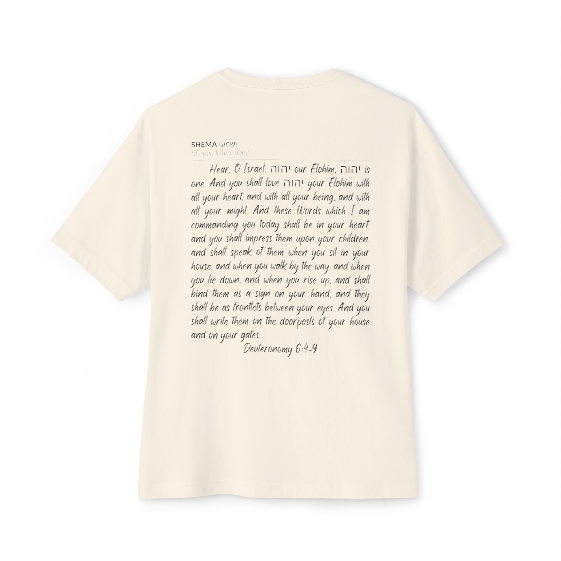 Soft and thoughtful, this oversized tee wears quiet devotion on its sleeves — and its back. The front features “Shema” in both English and Hebrew, a gentle call to daily attention and reflection. Across the back, Deuteronomy 6:4–9 is printed, turning the shirt into a wearable reminder to speak, bind, and carry faith through everyday life. The relaxed, boxy silhouette drapes effortlessly over layers and moves with you without fuss. Choose a muted tone to keep the text subtle, or pick a bolder color to let the words stand out in study, reflection, or moments of quiet mindfulness. This tee settles into your rotation: comfortable for busy days, gentle during gatherings, and quiet company during walks or personal reflection.